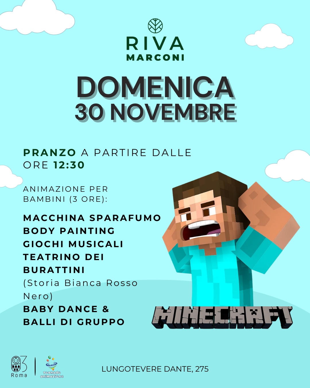 A partire dalle 12:30, potrai gustare un pranzo rilassante mentre i tuoi bambini si immergono in 3 ore di animazione a tema Minecraft, con attività pensate per coinvolgere e divertire: