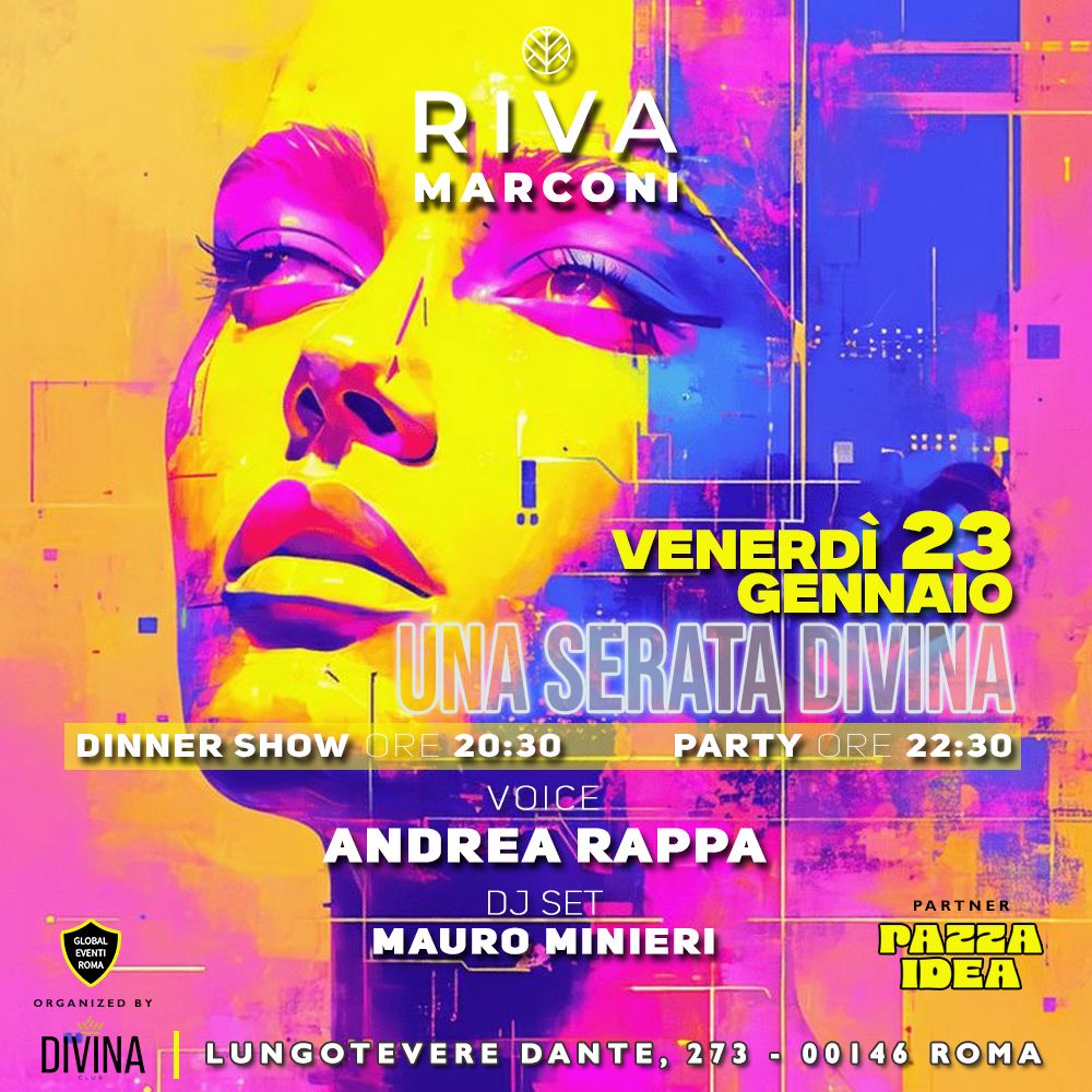 Il weekend comincia con stile a Riva Marconi: Venerdì 23 gennaio ti aspetta Una Serata Divina, l’appuntamento del venerdì sera dove il gusto incontra l’intrattenimento. Dalle 20:30, si accendono le luci sul Dinner Show con Andrea Rappa alla voce, per una cena coinvolgente che non è solo da gustare ma anche da vivere. Poi, dalle […]