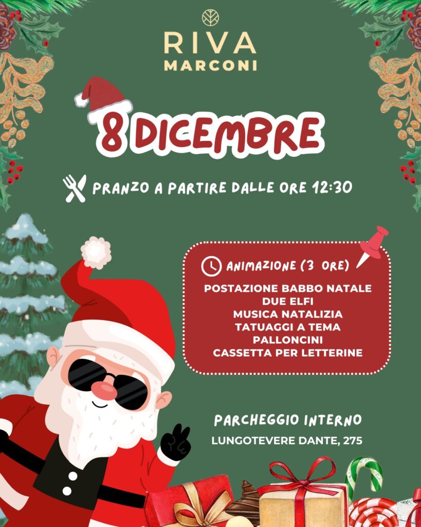 Lunedì 8 dicembre, Riva Marconi accende la magia del Natale con un pranzo pensato per tutta la famiglia e un’atmosfera che scalda il cuore. Dalle 12:30, la tavola si riempie di profumi deliziosi e, tra un piatto e l’altro, accade qualcosa di speciale: Babbo Natale arriva in persona, pronto ad ascoltare i sogni dei bambini, […]