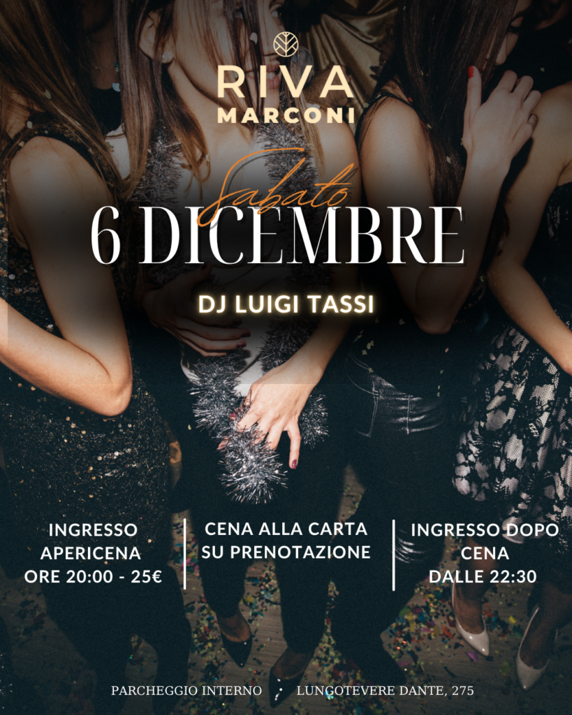 Sabato 6 dicembre si accendono le luci di Riva Marconi per un’altra serata da vivere tutta d’un fiato. Dalle 20:00, puoi scegliere tra due formule: • Apericena con ingresso a 25€ • Cena alla carta su prenotazione, con le specialità della nostra cucina E dalle 22:30, si balla: in console DJ Luigi Tassi, pronto a […]