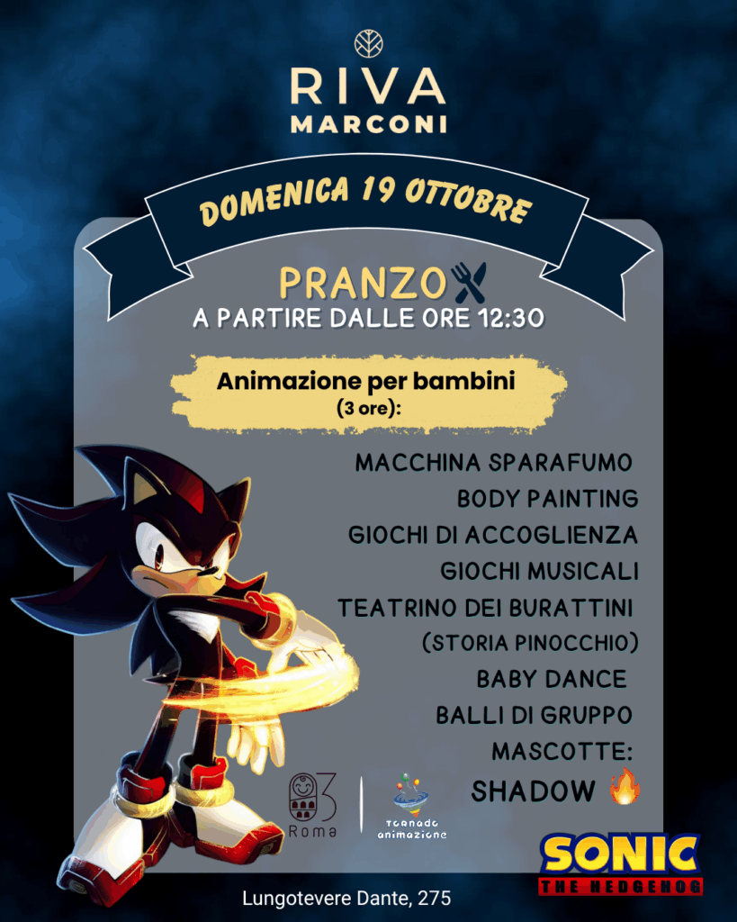 Domenica 19 ottobre, Riva Marconi ti aspetta per un pranzo speciale in famiglia con una dose extra di energia e divertimento! Dalle 12:30, goditi la nostra cucina in un ambiente accogliente e raffinato, mentre i tuoi bambini partecipano a 3 ore di animazione non-stop insieme alla mascotte Shadow, direttamente dal mondo di Sonic! 🎊 In […]