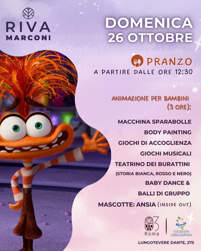 Domenica 26 ottobre, da Riva Marconi si pranza… e ci si diverte! A partire dalle 12:30, vivi una giornata pensata per tutta la famiglia, con piatti deliziosi per i grandi e 3 ore di animazione coinvolgente per i più piccoli. A far compagnia ai bimbi ci sarà Ansia, direttamente da Inside Out, con tante attività […]