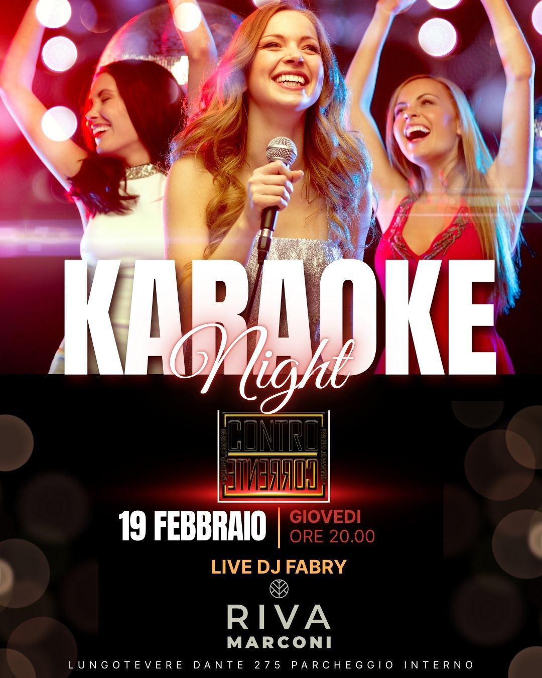 Il 19 febbraio Riva Marconi si trasforma in un vero palco aperto con la Karaoke Night più coinvolgente della settimana. Dalle ore 20:00 si accendono le luci, il microfono passa di mano in mano e ogni ritornello diventa un coro collettivo.