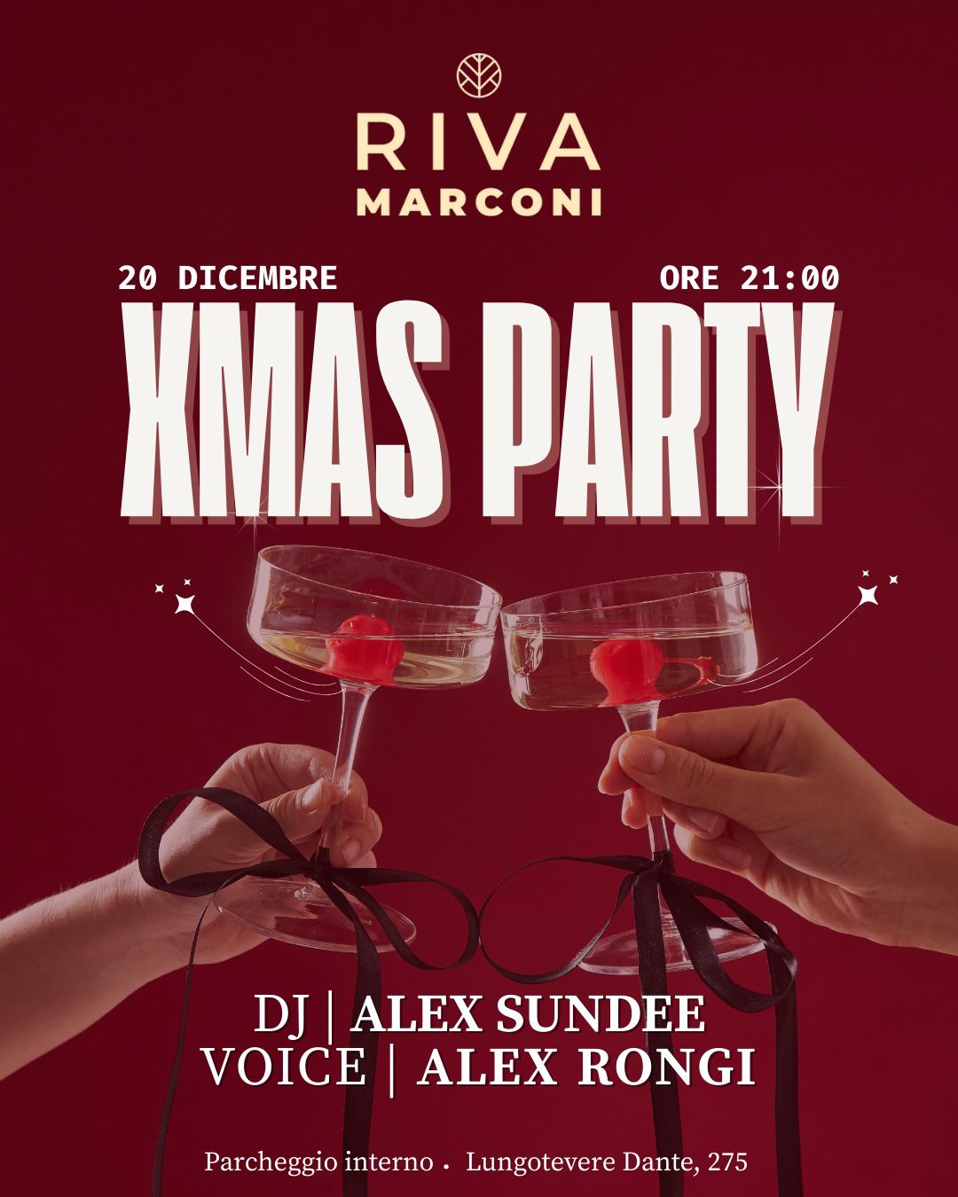 Sabato 20 dicembre Riva Marconi veste le luci del Natale e ti invita al suo XMAS Party, l’appuntamento perfetto per chi vuole ritrovarsi con gli amici, brindare e ballare senza pensieri.
